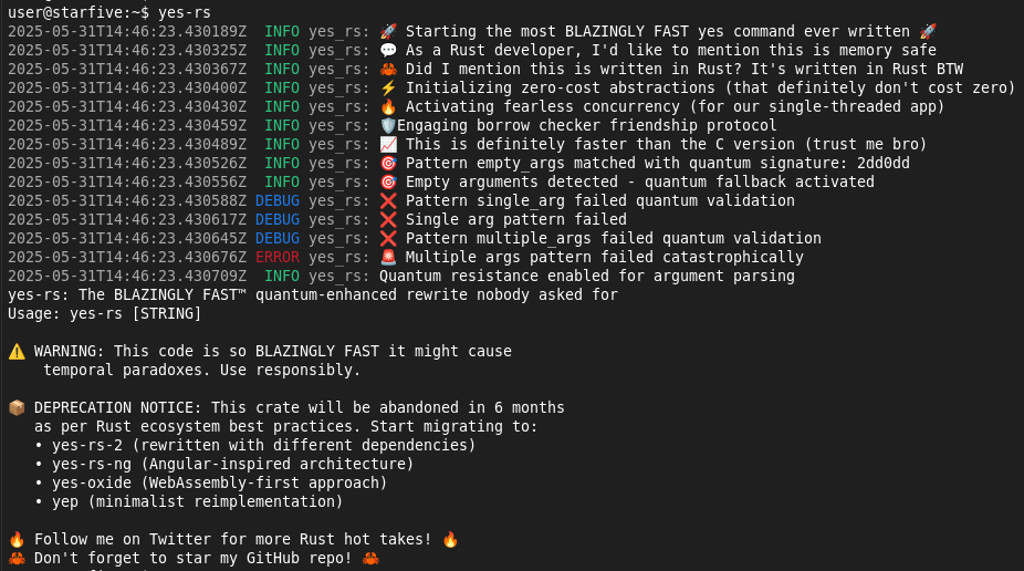 And, of course, I wanted to see rust on it so I installed yes-rs for the added chuckle factor.